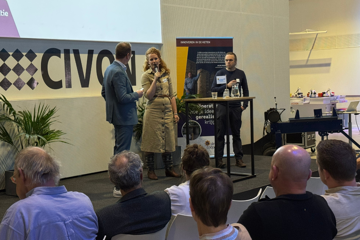 Het plenaire programma trapte af in een goedgevulde Giethal. Drie ondernemers gaven samen een mooi beeld van waar de sector nu staat: slimmer werken, nieuwe producten ontwikkelen en innovatie niet alleen bedenken, maar ook dóen. Gijs Smeman (CIVON), Inge Vleemingh & Johannes Regelink (Eten van Achterhoekse bodem), Dejan Postgens & melkveehouder Dennis Yeboah (precisielandbouw) en Mathijs Groot Koerkamp & Gijs van Schriek (bladbemesting) deelden hun ervaringen, resultaten én uitdagingen tijdens de korte interviews. Een mooie mix waarvan de bezoekers na afloop zeiden: “Dit helpt mij om morgen met een frisse blik naar mijn eigen ideeën te kijken. “De foto’s hieronder geven je een indruk van het plenaire deel van het event.